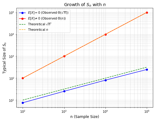 - 当 $\mathbb{E}[X]\neq0$ 时,根据 LLN 为 $\Theta(n)$