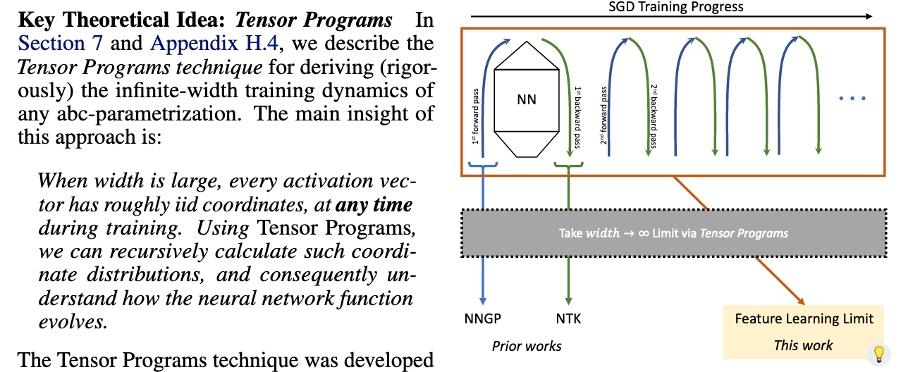 那么如何从这些限制条件中得到 μP,主要依赖作者前序工作 Tensor Programs——简单来说任意的神经网络计算可以程序化,从而递归得到神经网络训练任意步数下的分布。